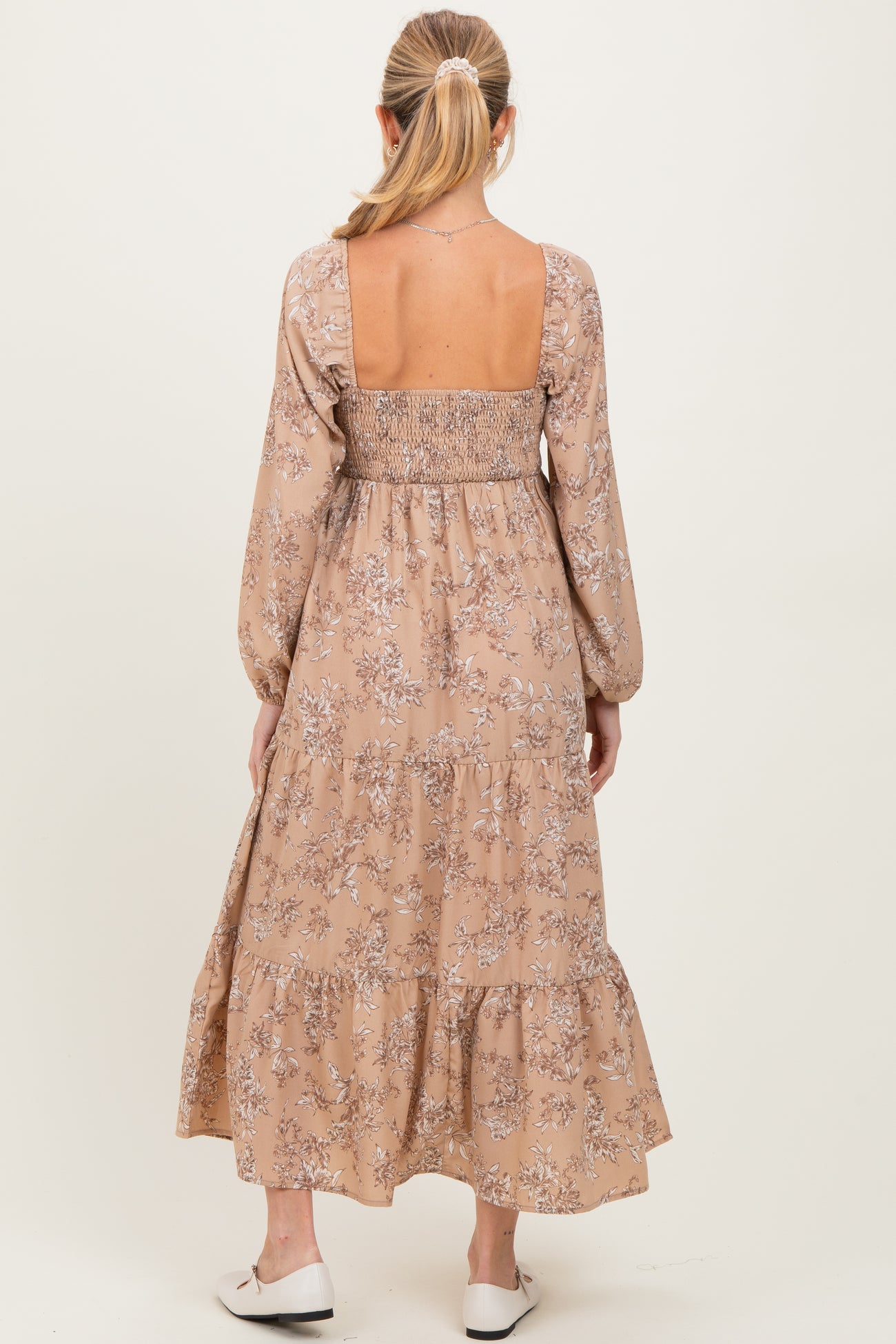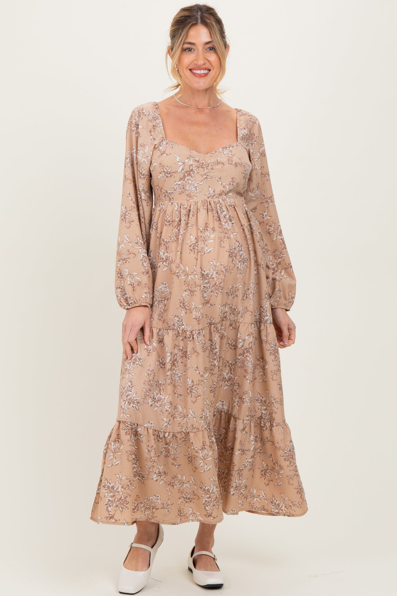 Embrace elegance and comfort with this Antique Floral Neck Maternity Maxi Dress, designed to flatter your growing bump while keeping you stylish. Featuring a romantic square neckline and long puff sleeves with elastic cuffs, this dress offers a perfect blend of femininity and ease. The tiered maxi silhouette allows for effortless movement, making it ideal for any occasion—from casual outings to special events. Crafted from soft, breathable fabric, it ensures all-day comfort throughout your pregnancy journey. Pair it with flats or heels for a timeless maternity look you'll love.