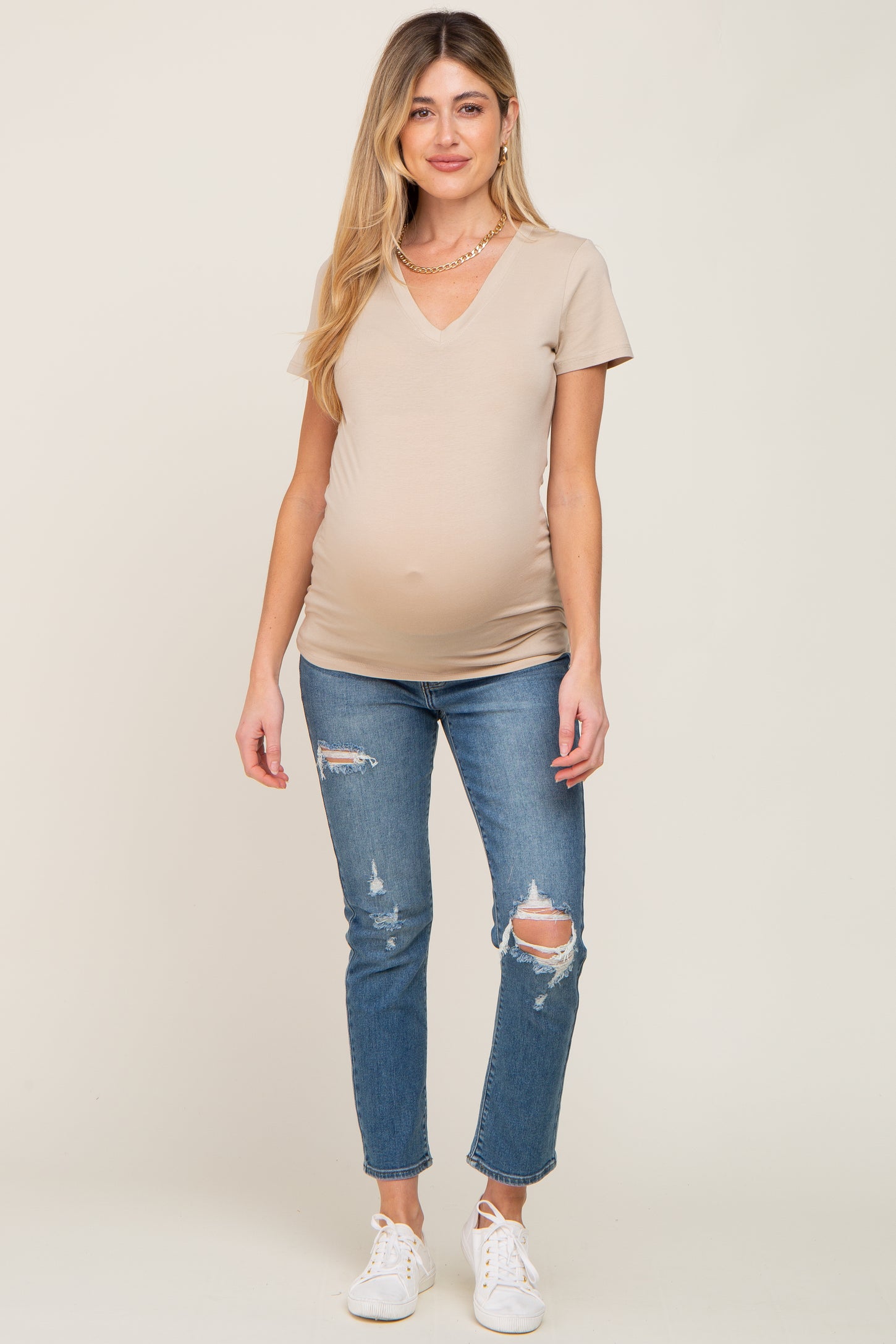 Beige Basic V-Neck Maternity Tee