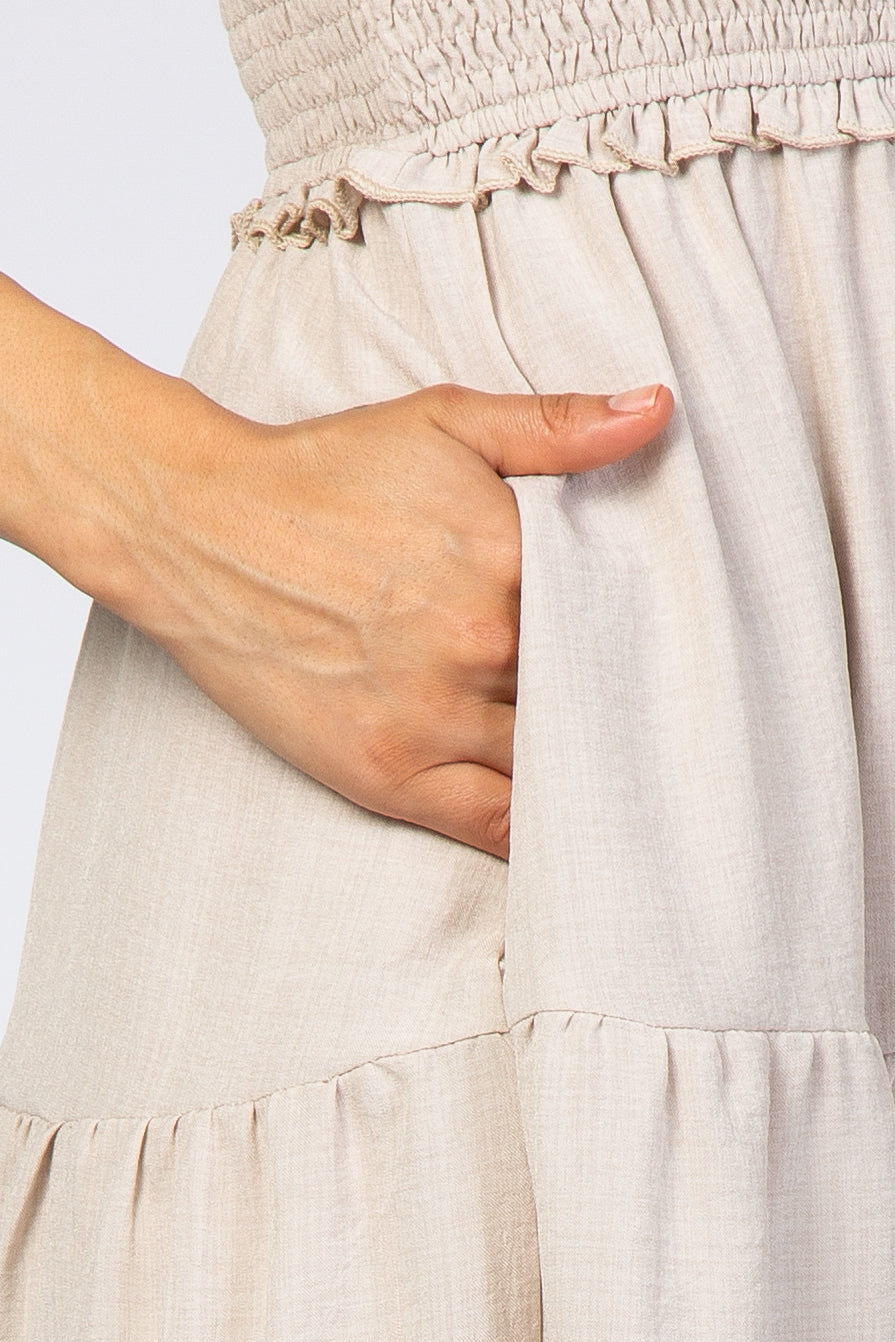 Beige Bow Strap Tiered Midi Dress