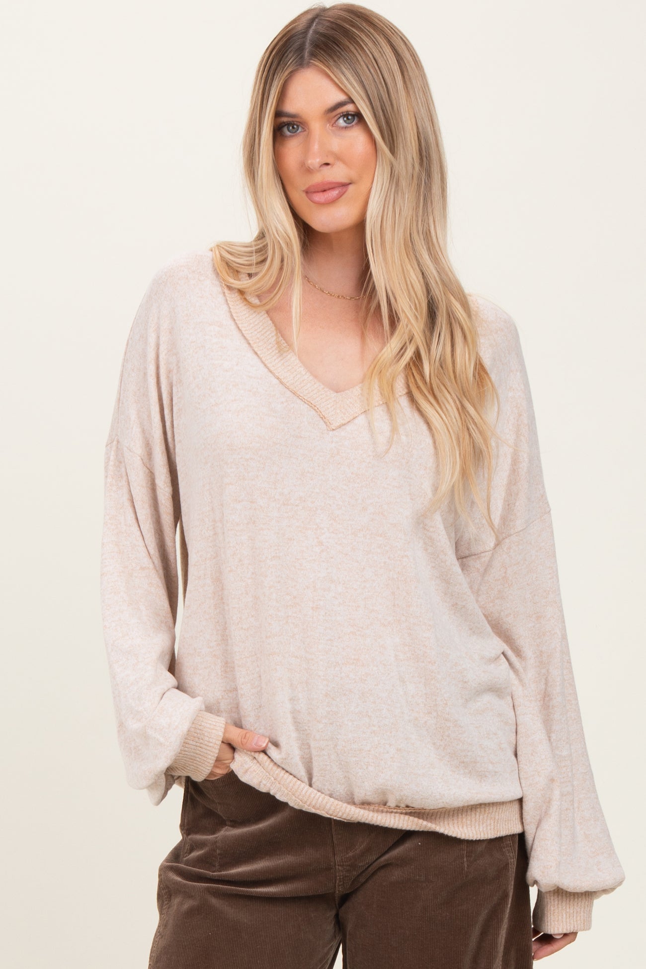 Beige Brushed Long Sleeve Ribbed V-Neck Top