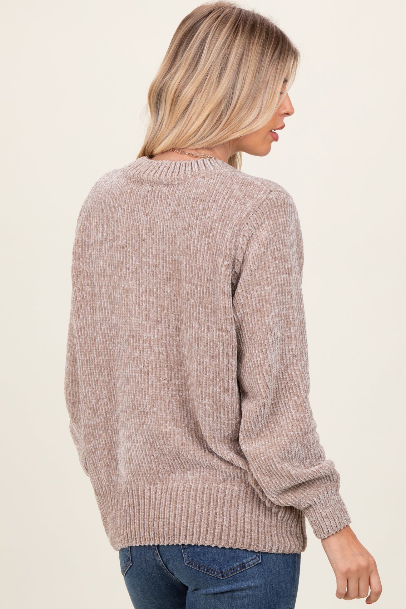 Cozy up in our Beige Chenille Knit Sweater, the perfect blend of softness and style. This lightweight sweater features a plush chenille texture with a relaxed fit, ribbed crew neckline, cuffs, and hem for added comfort and shape. Its versatile beige hue pairs effortlessly with jeans or skirts for a casual yet chic look. Ideal for chilly mornings or layering through the seasons, this sweater is your go-to piece for both cozy comfort and everyday elegance. Easy to wear, easy to love—add this wardrobe essential to your collection now!