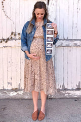 A chiffon midi dress featuring a rounded neckline, short ruffle sleeves, a pleated skirt, a keyhole back with a button closure and double lined for added coverage. This style runs big.