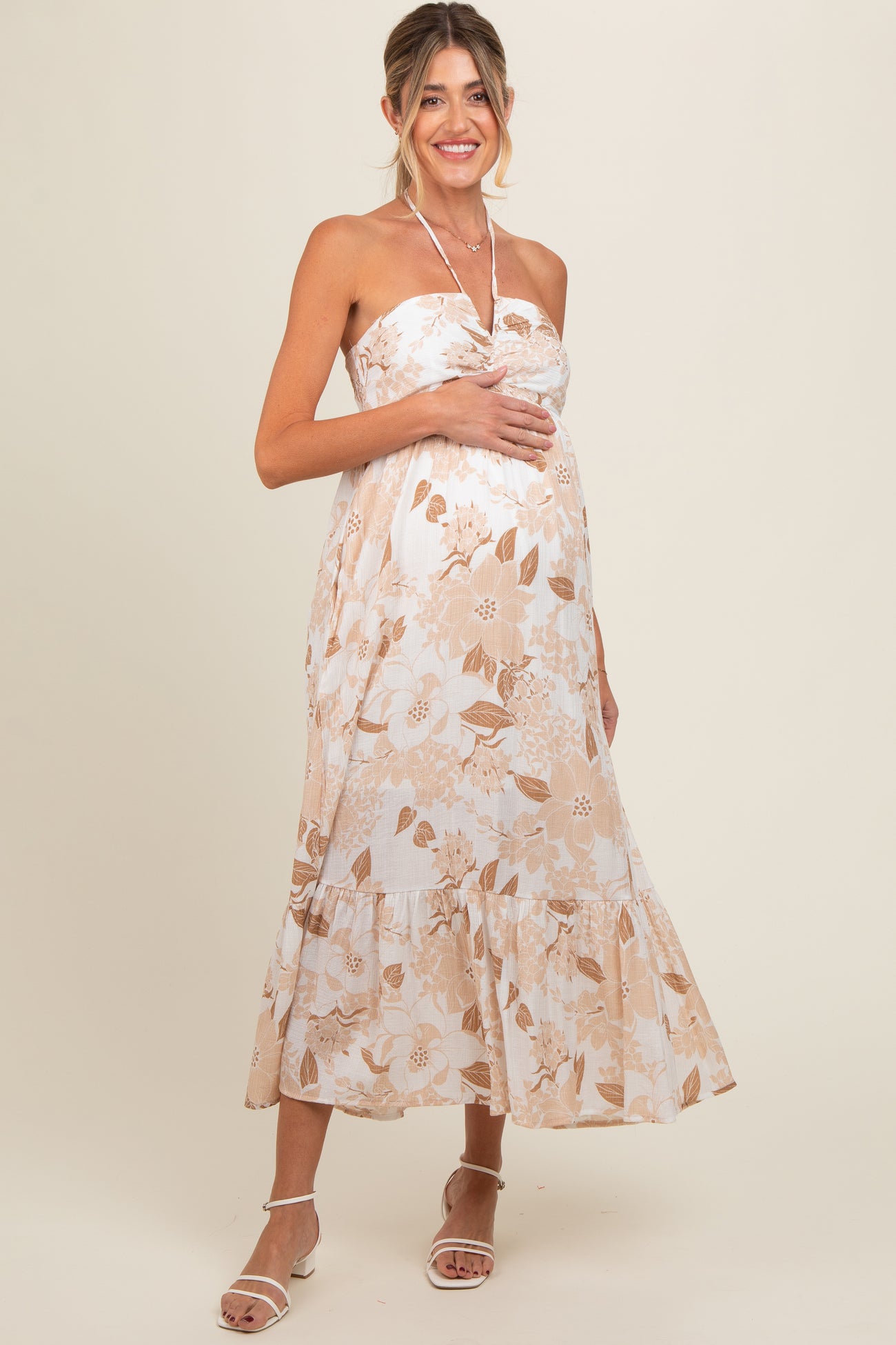 Beige Floral Ruched Front Halter Maternity Midi Dress
