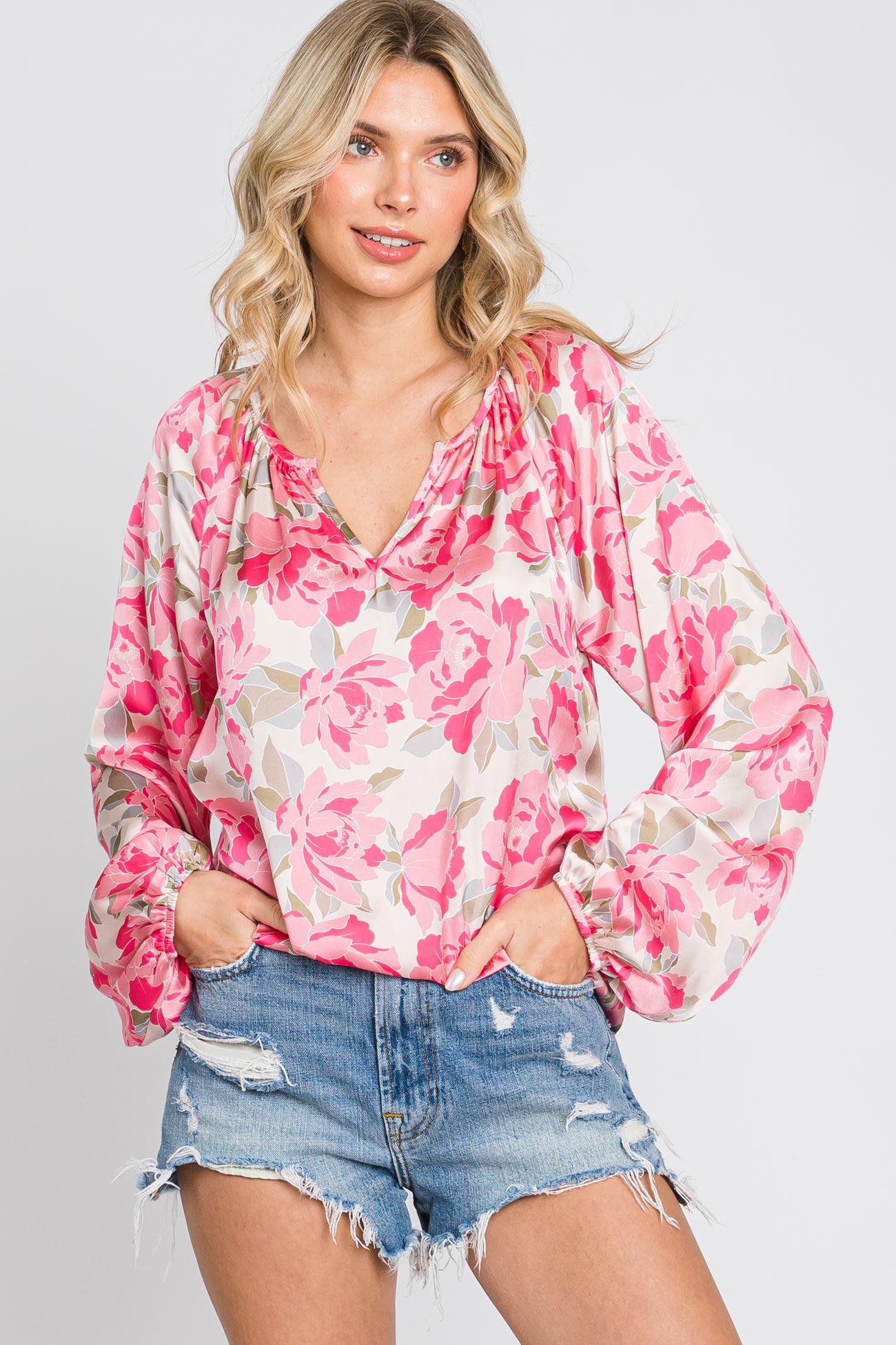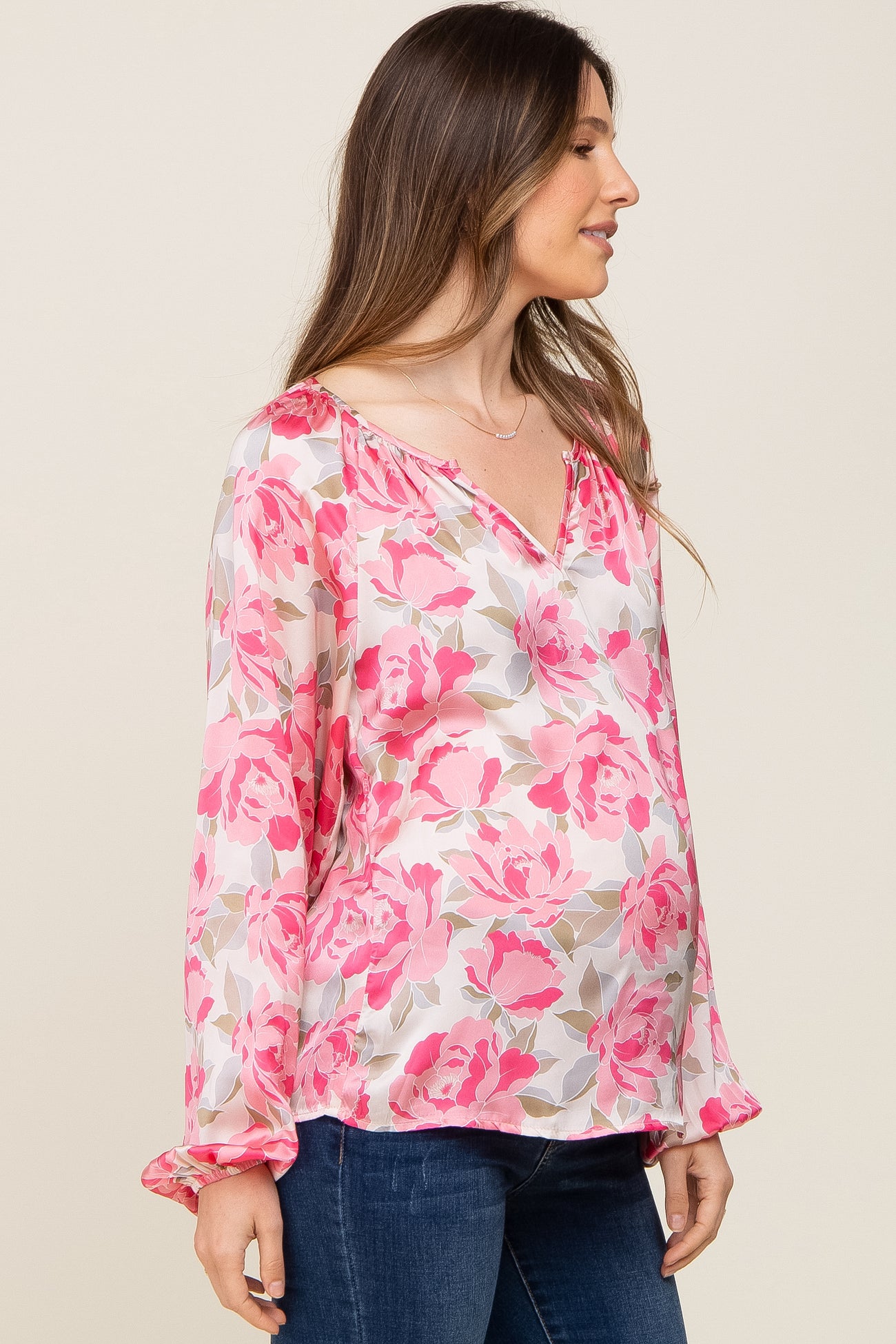 A floral maternity blouse top. Features a satin fabric, a split v-neckline, and long cinched sleeves.