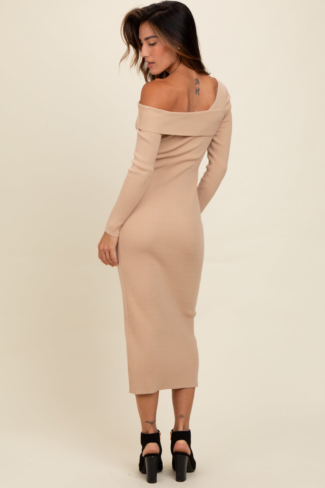 Beige Foldover One Shoulder Maxi Sweater Dress