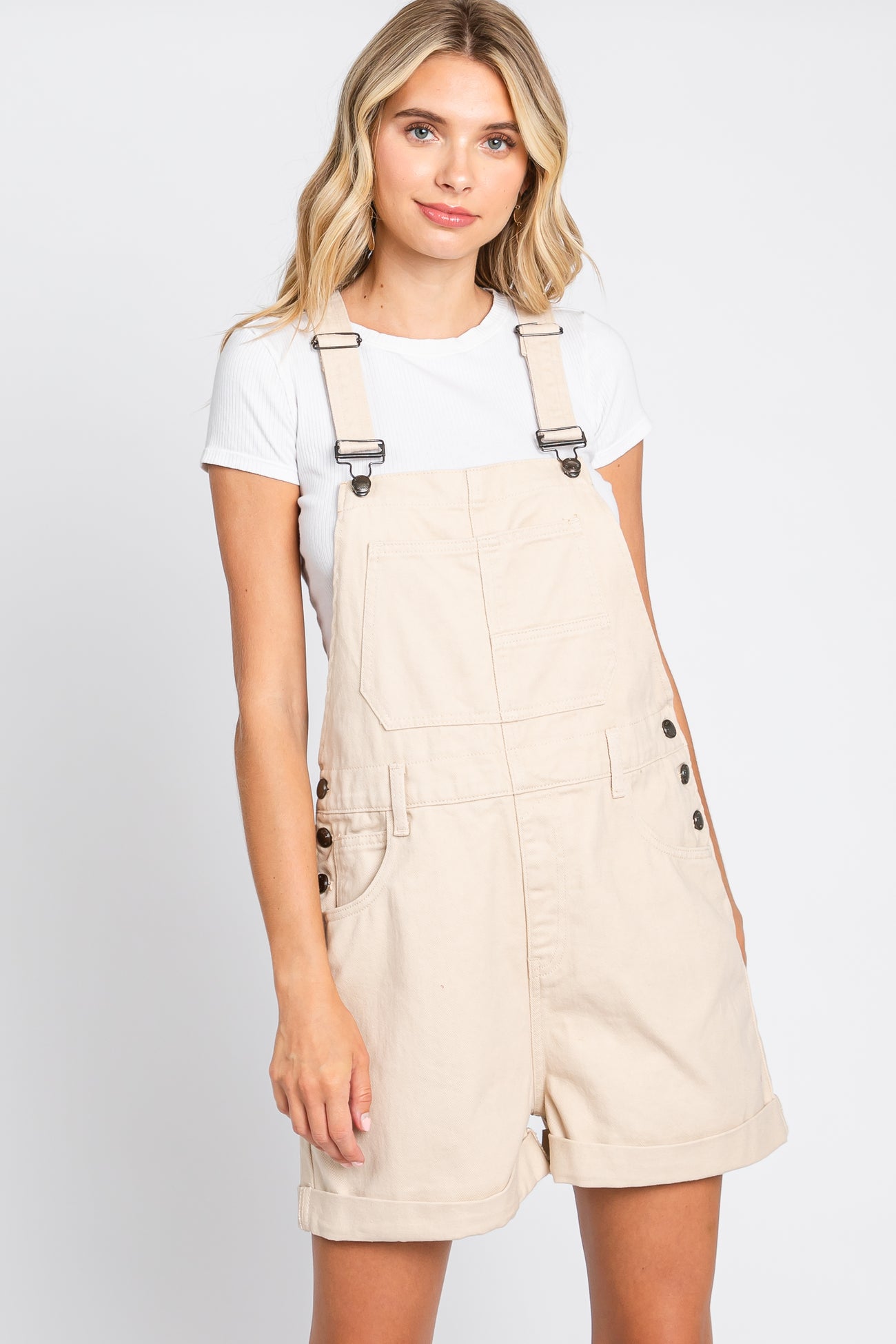 Details A overall with cuffed shorts, a front pocket, side pockets, side buttons, and adjustable straps. Content + Care