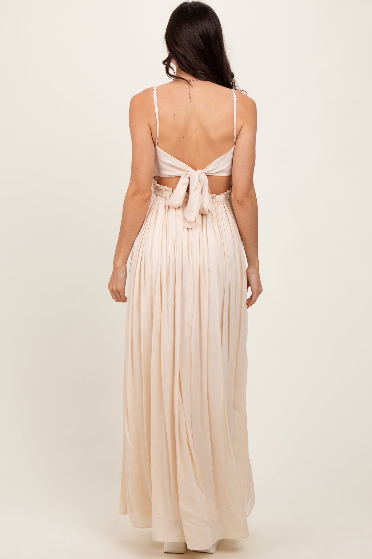 Beige Lace Bodice Cutout Tie Back Maxi Dress