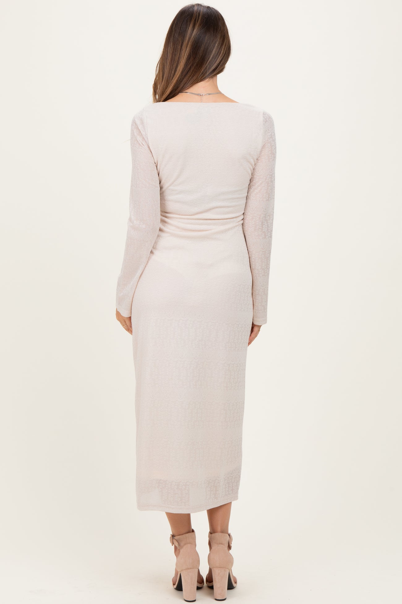 Beige Lace Jacquard Long Sleeve Maternity Midi Dress