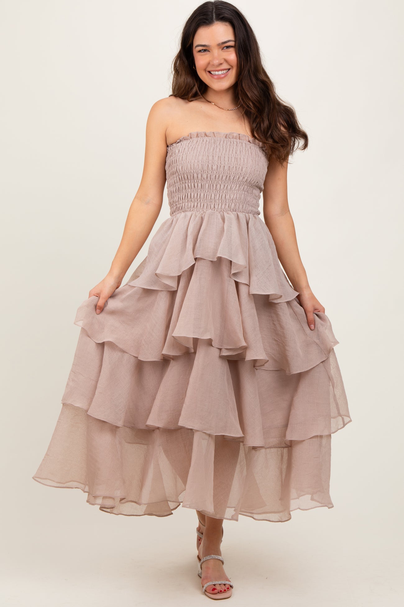 Embrace elegance with our Beige Layered Maxi Dress, perfect for any special occasion. This strapless dress features a smocked bodice that offers a comfortable, secure fit while highlighting your shoulders and neckline. The cascading layered skirt adds volume and movement, creating a graceful silhouette that flows beautifully with every step. Crafted from lightweight, breathable fabric, this maxi dress ensures you stay cool and stylish all day or night. Pair it with your favorite heels and delicate jewelry for a timeless, chic look. Available in multiple sizes.