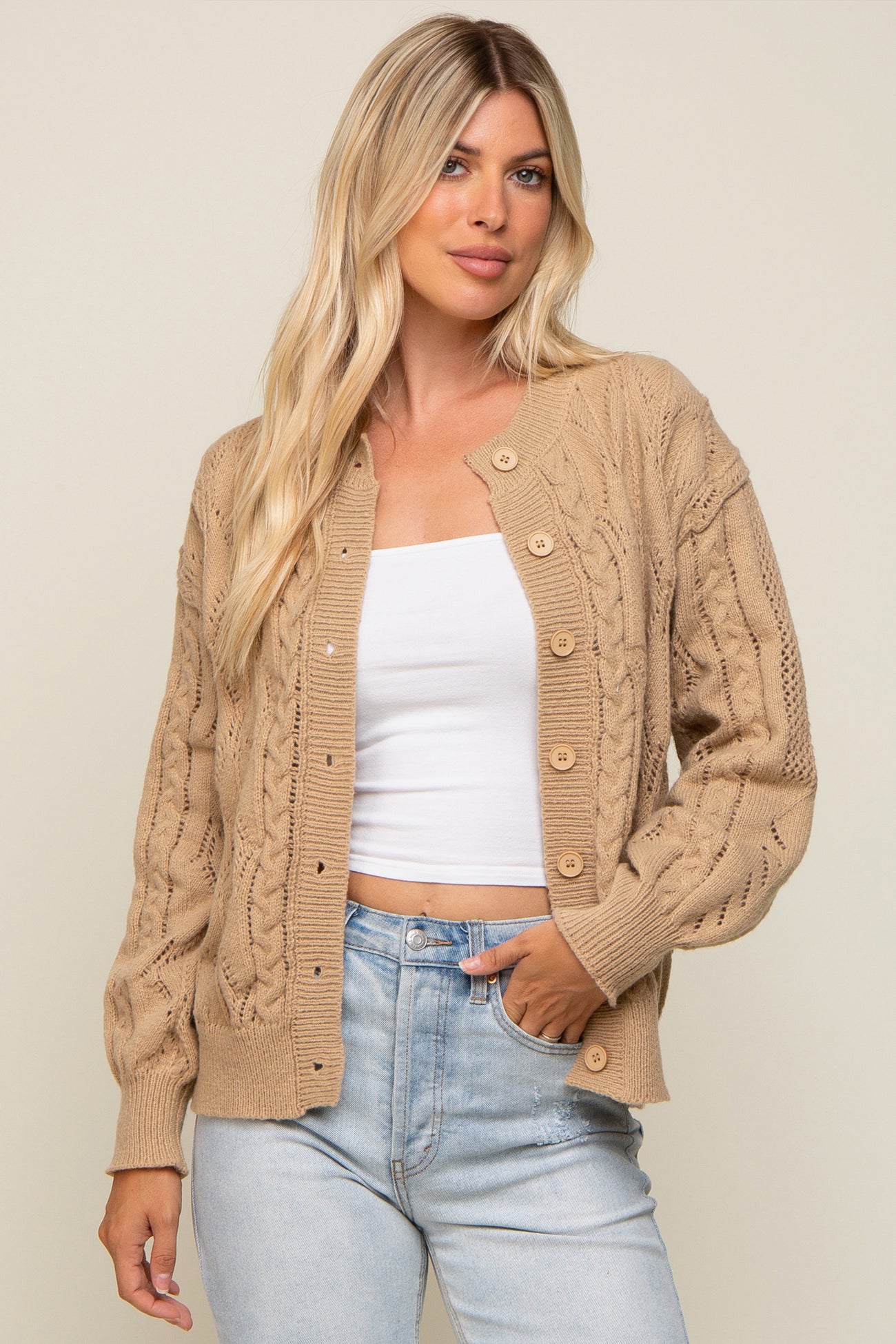 A solid chunky knit maternity cardigan with a round neckline and button up front closure.