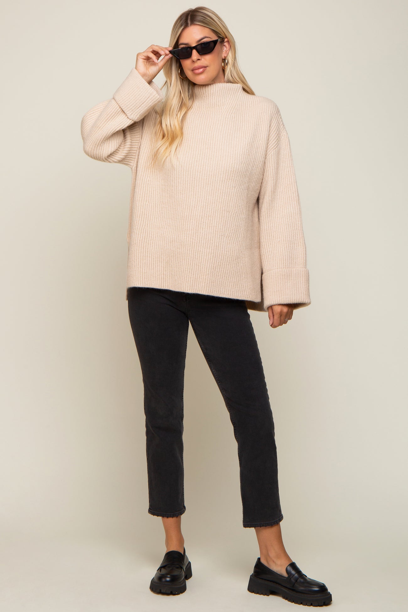A solid thick knit sweater with a mock neckline, side slits and oversized cuffed sleeves.