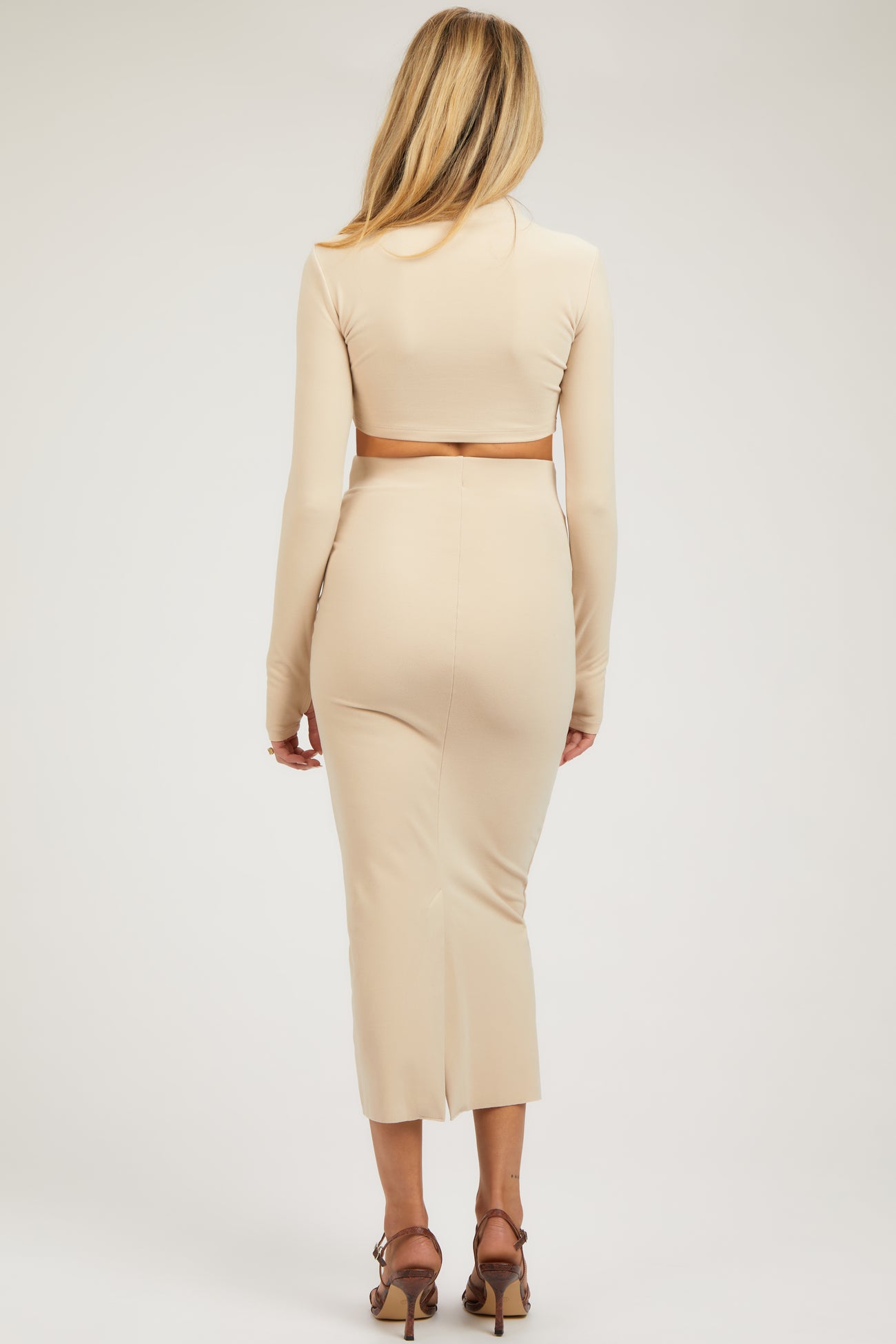 Details A soft knit maternity set featuring a mock neck long sleeve crop top and a fitted midi skirt. Content + Care