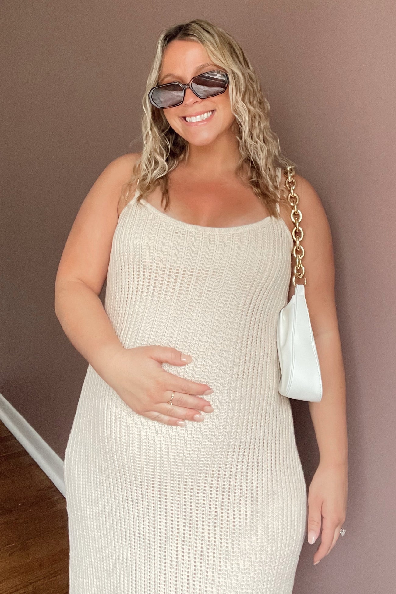An open knit crochet maternity dress featuring adjustable straps and a scoop neckline. Dress is lined.