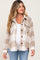 A thick knit maternity shirt jacket in a plaid print with a collared neckline, button front closure, and two front pockets.