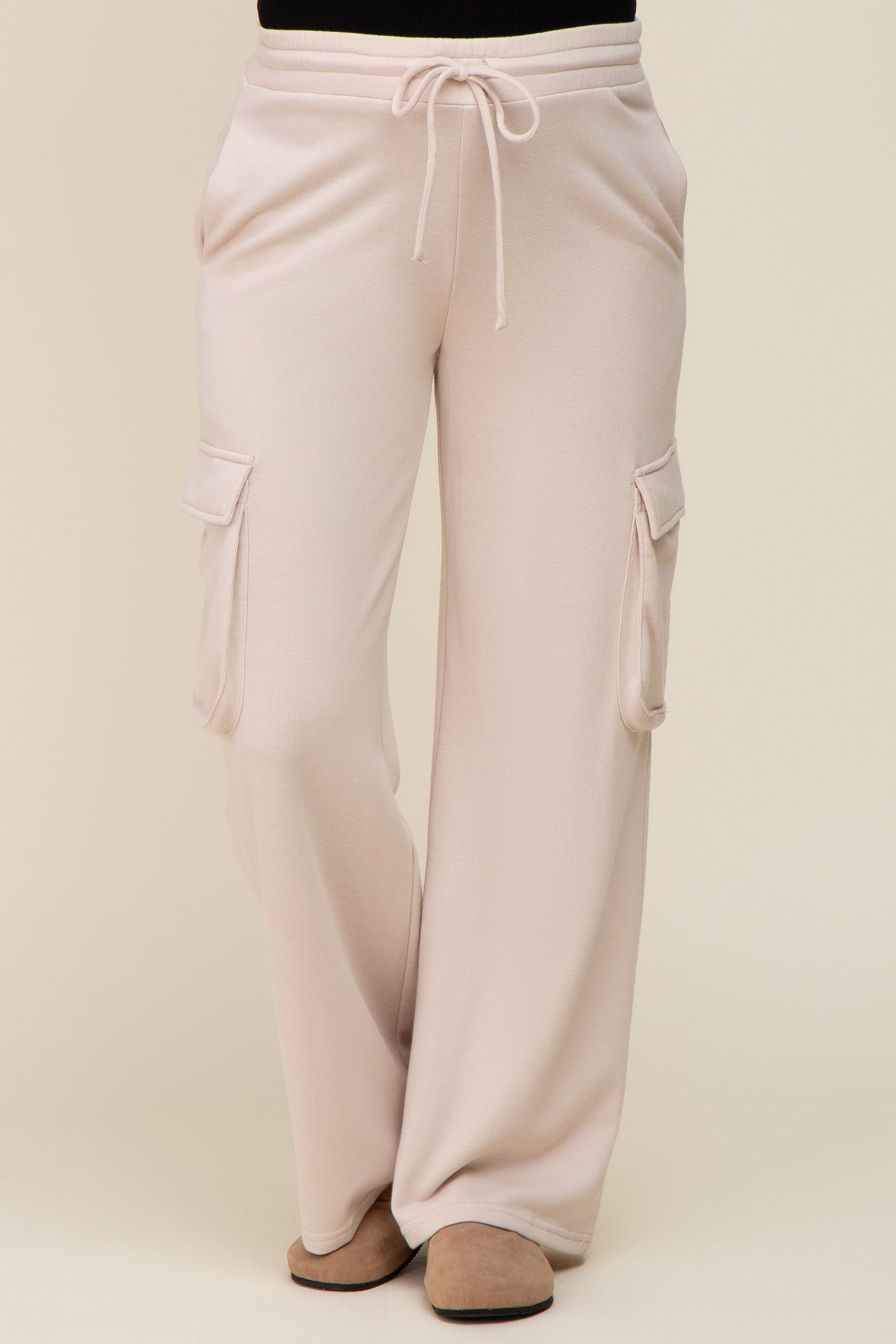 A pair of maternity sweatpants featuring five pockets and a drawstring waist.