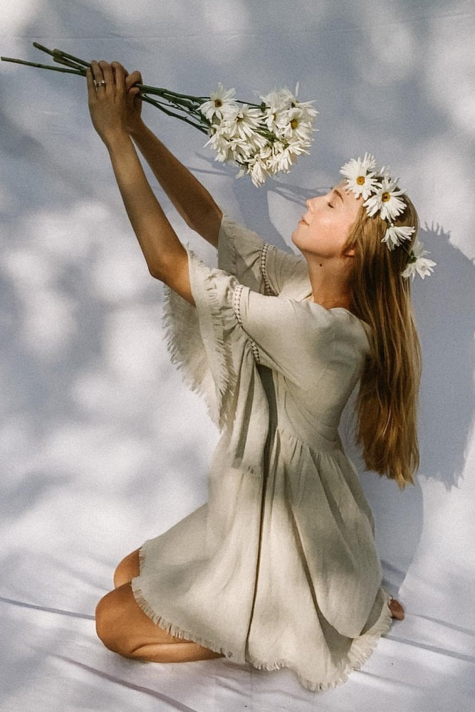A solid hued babydoll dress featuring a raw edge, bell sleeves, a crochet trim, a rounded neckline and a back keyhole cutout with a button closure. This style runs big.