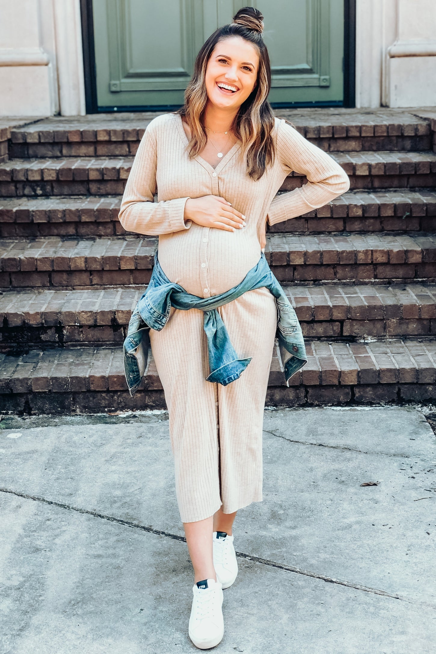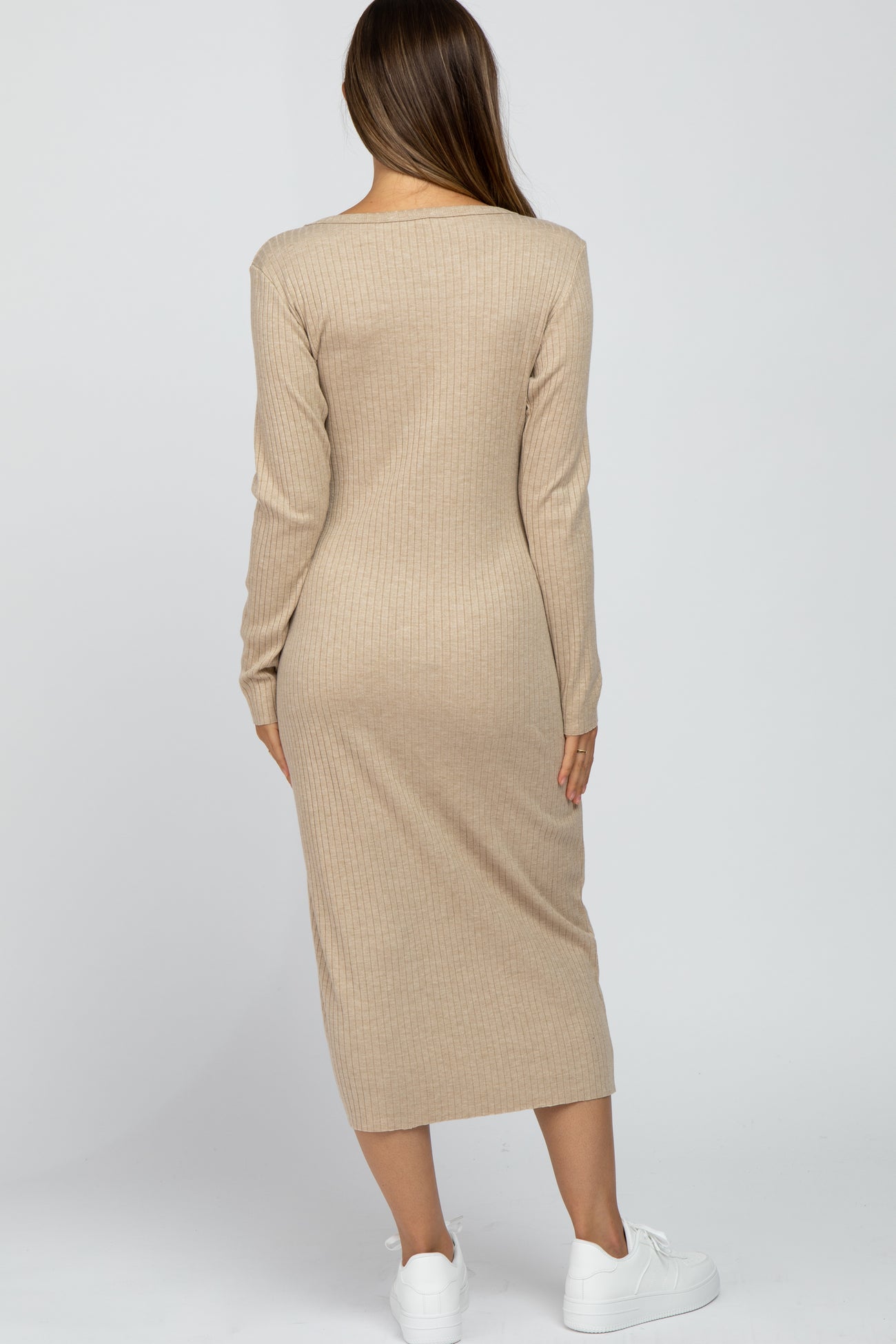 Beige Ribbed Button Front Midi Cardigan Maternity Dress