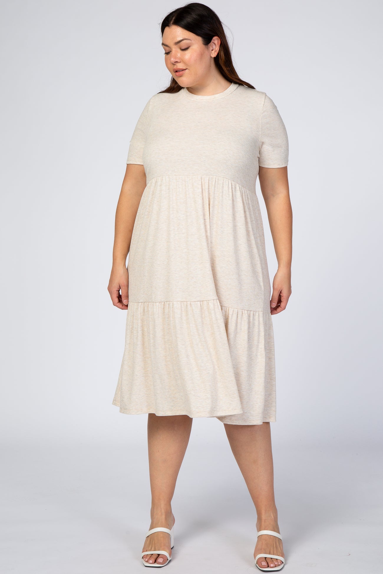 A solid ribbed short sleeve plus dress with scoop neckline and tiered body.