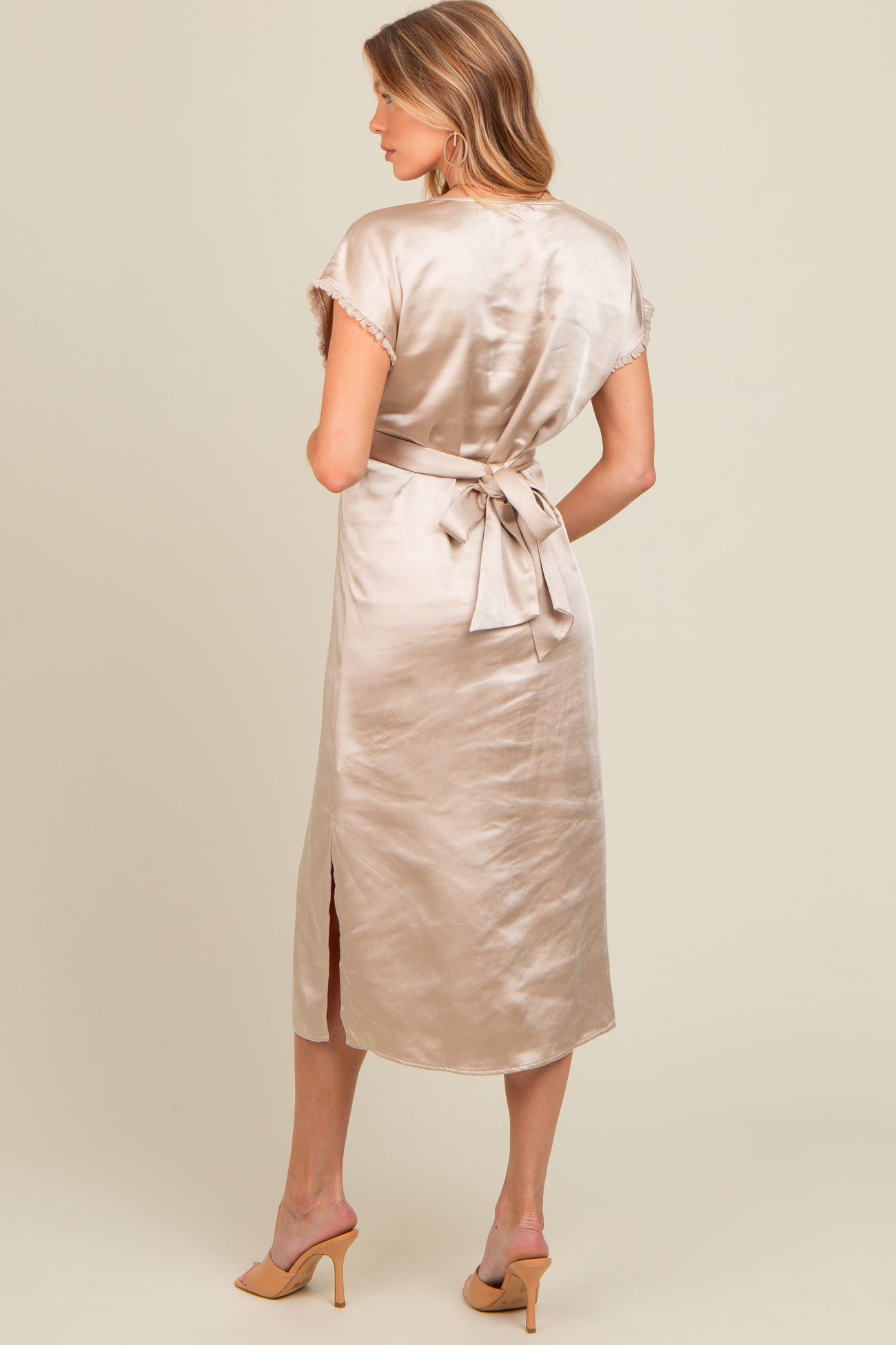 Beige Satin V-Neck Fringe Detail Maternity Midi Dress