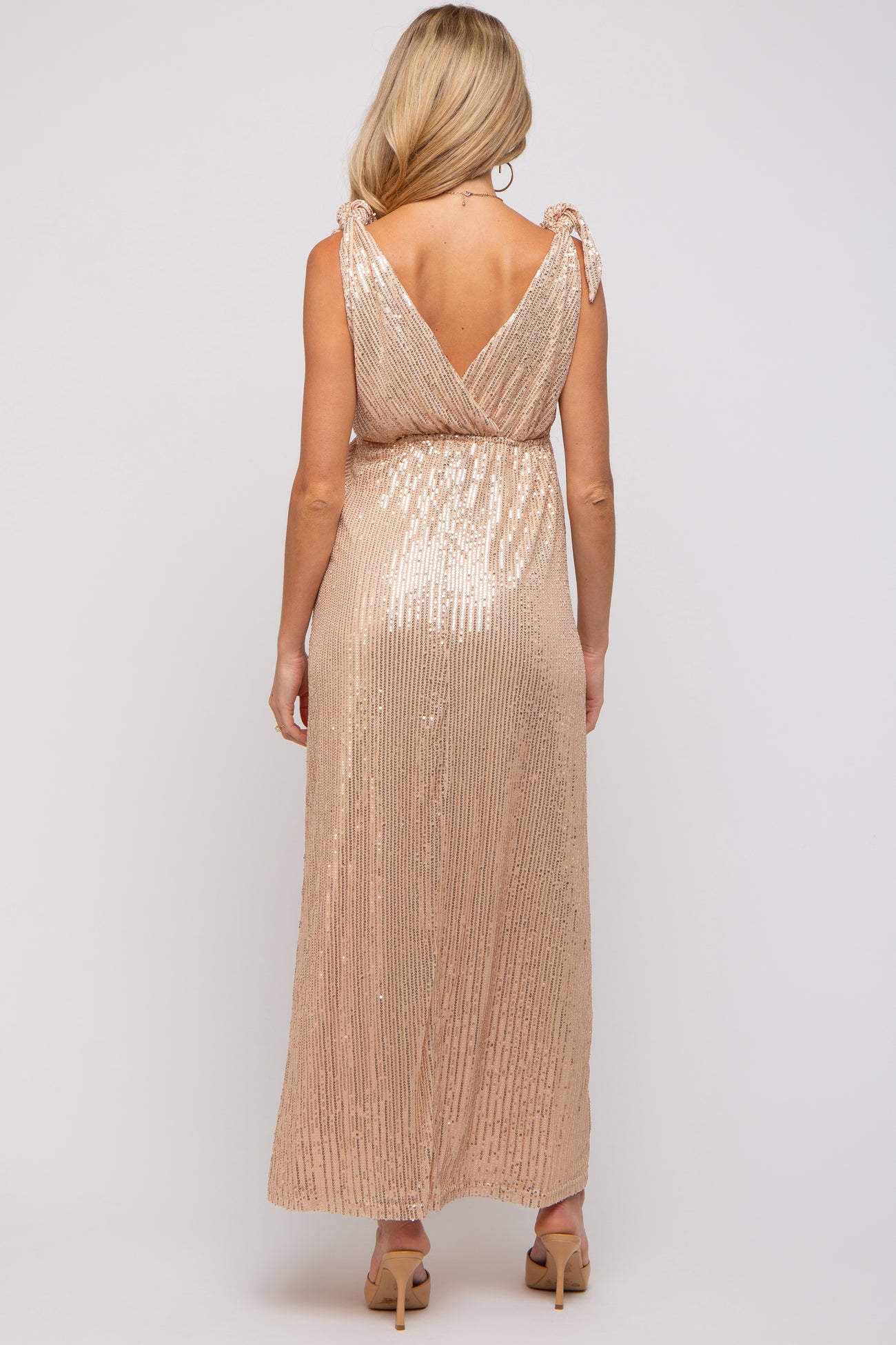 Beige Sequin Sleeveless Wrap V-Neck Maternity Gown