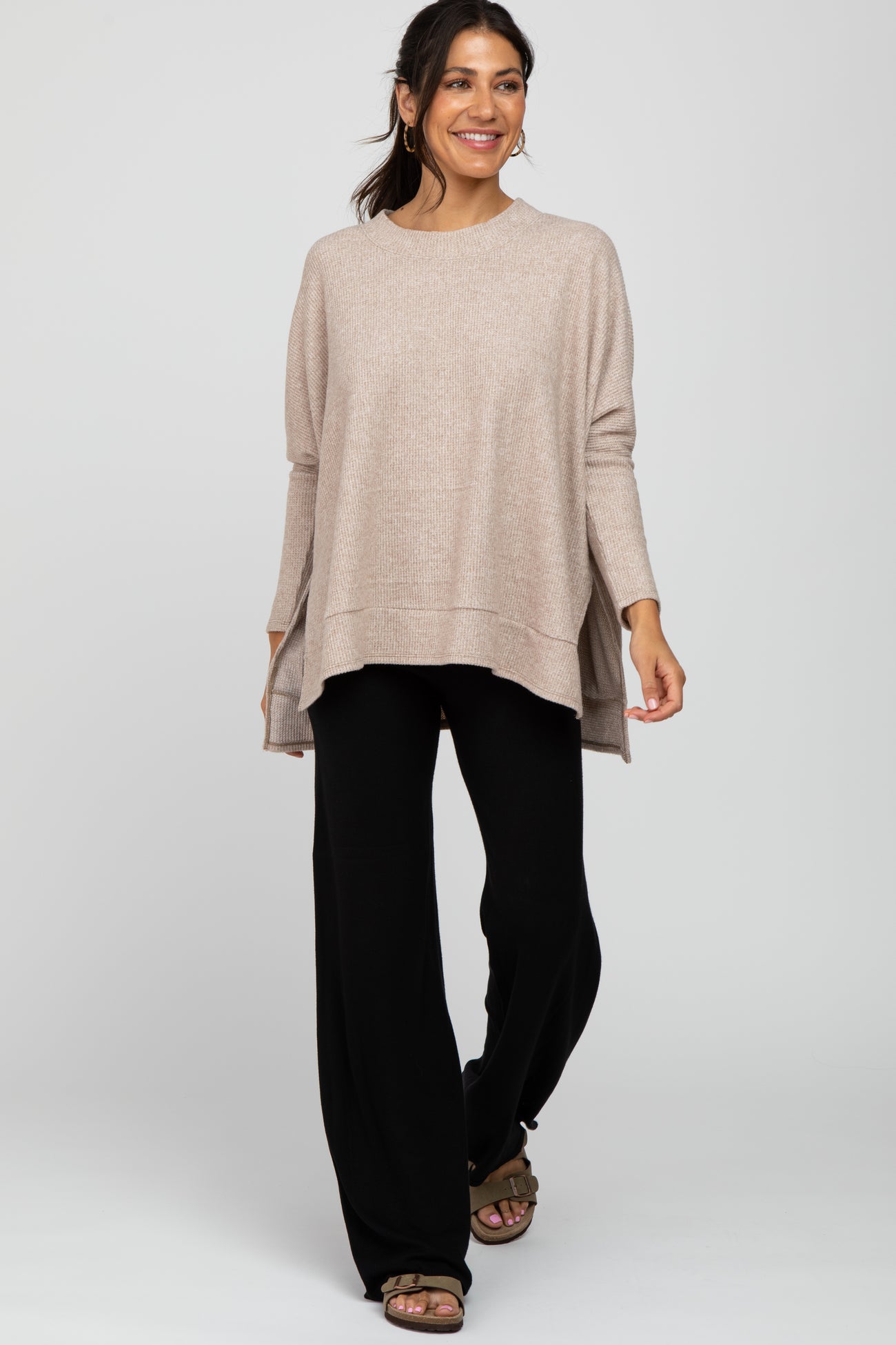A long sleeve dolman top. Features waffle soft knit material and two side slits.