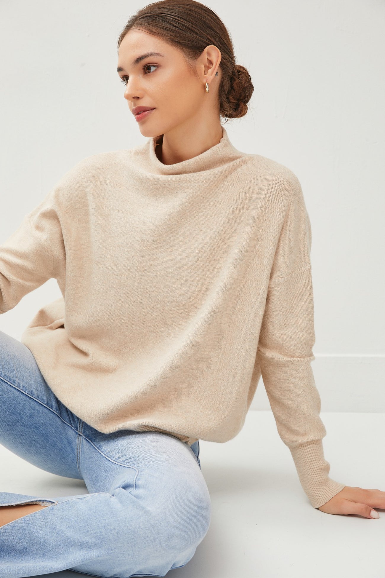 An ultra soft knit sweater featuring a mock neckline, long sleeves and a ribbed trim.