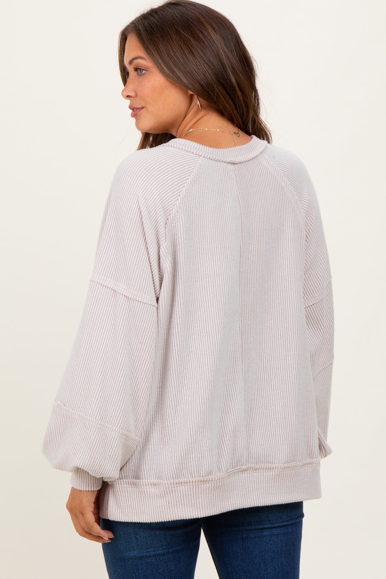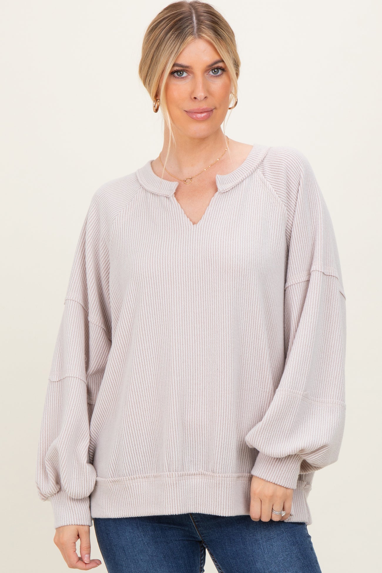 Beige Solid Rib Long Sleeve V-Neck Oversized Maternity Tunic Top