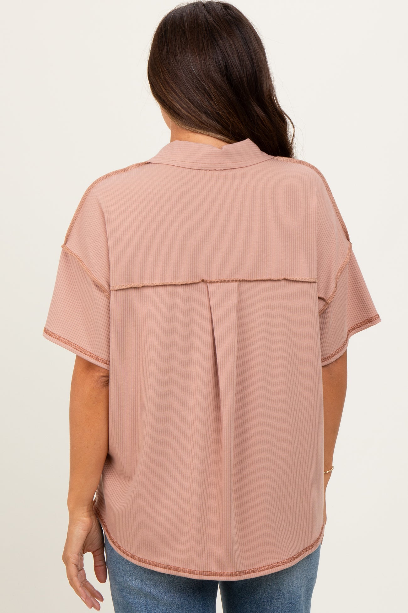 Beige Solid Ribbed Collar V-Neck Maternity Tunic Top