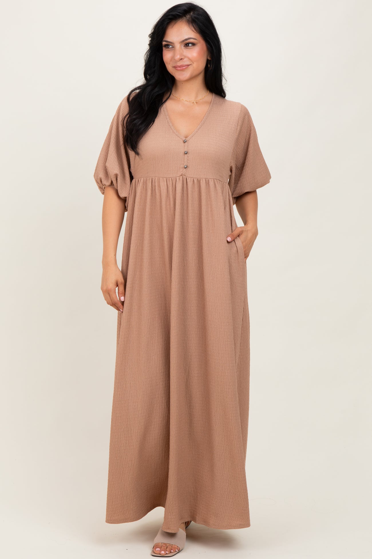 Step into effortless elegance with our Beige Solid Woven 3/4 Sleeve V-Neck Button Down Maxi Dress. Crafted from soft, breathable fabric, this maxi dress features a flattering V-neckline and delicate button details for a timeless touch. The 3/4 puff sleeves add a stylish volume, while the relaxed fit and flowing silhouette provide all-day comfort. Perfect for casual outings or dressier occasions, this versatile dress also includes convenient side pockets. Pair it with sandals or heels for a chic, modern look you'll love. Available in a beautiful neutral beige that complements any style.
