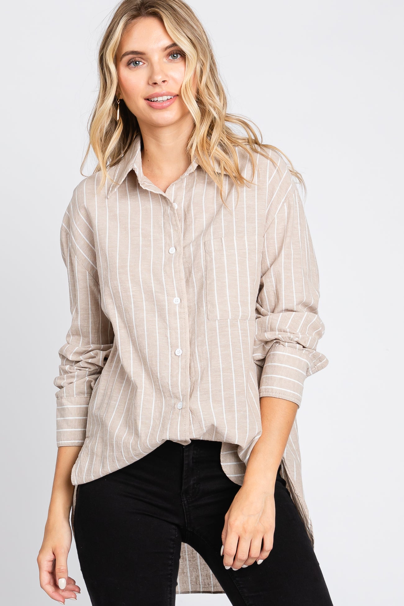 Beige Striped Button Up Long Sleeve Linen Maternity Top