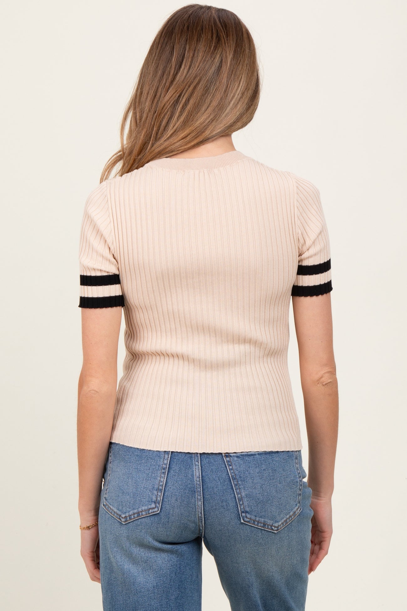 Beige Striped Short Sleeve Maternity Knit Top