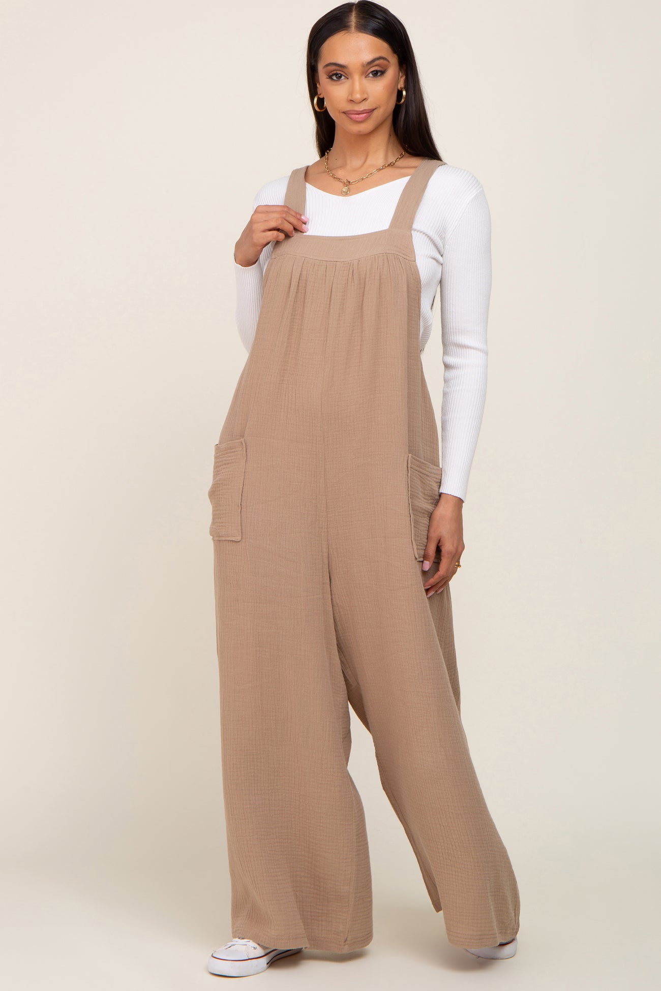 Beige Wide Leg Tie Back Maternity Overalls