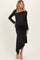 Elevate your maternity wardrobe with our Black Asymmetric Hem Maternity Midi Dress. Featuring a sleek, form-fitting silhouette, this dress beautifully hugs your baby bump while providing comfort with its soft, stretchy fabric. The unique asymmetric hem adds a modern touch, making it perfect for both casual outings and special occasions. Long sleeves and a subtle boat neckline offer elegant coverage, while the versatile black color complements any accessory. Designed to grow with you, this midi dress ensures you stay stylish and confident throughout your pregnancy journey. Pair with heels or flats for effortless chic.