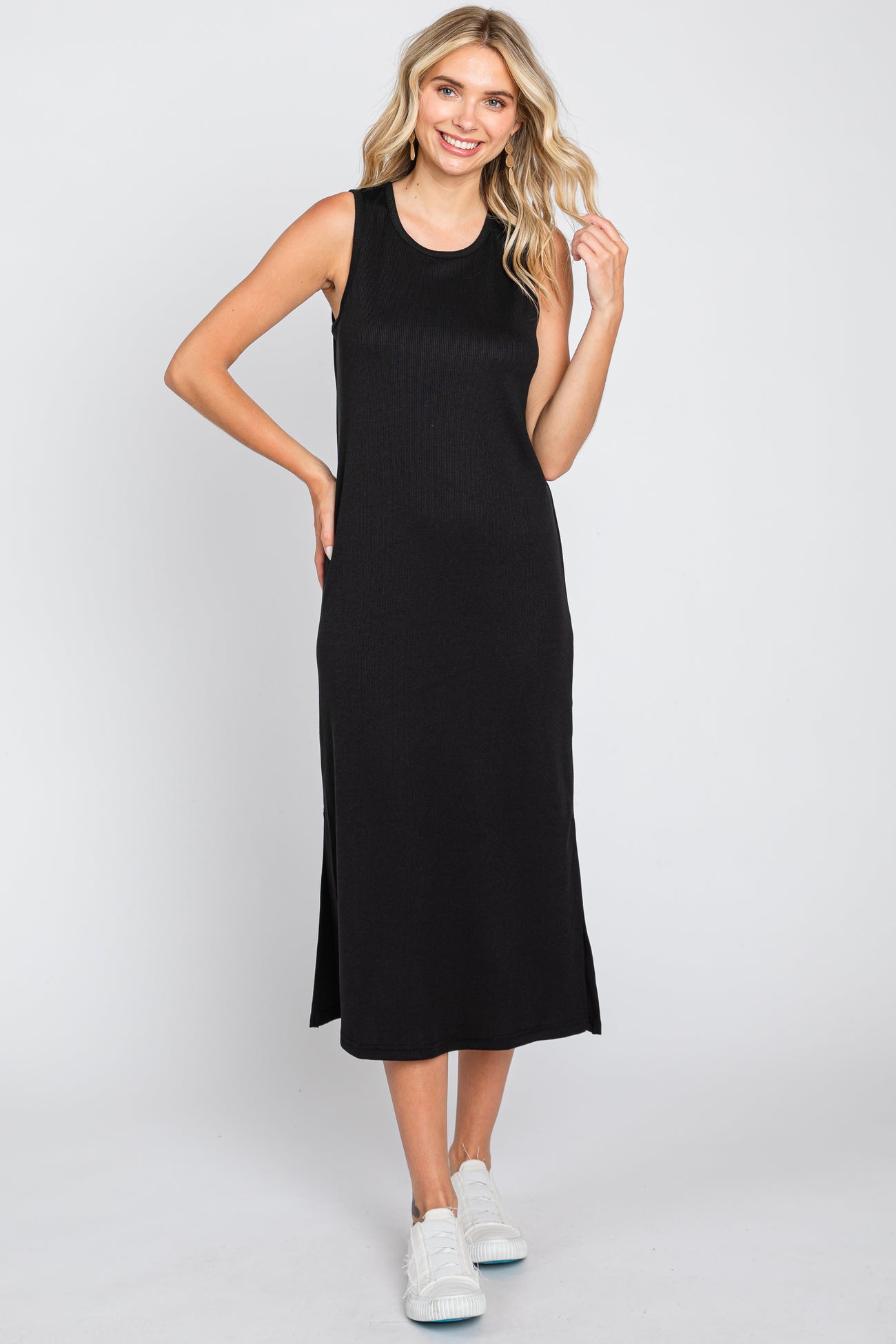 A solid sleeveless ribbed maternity midi dress with a round neckline and two side slits.