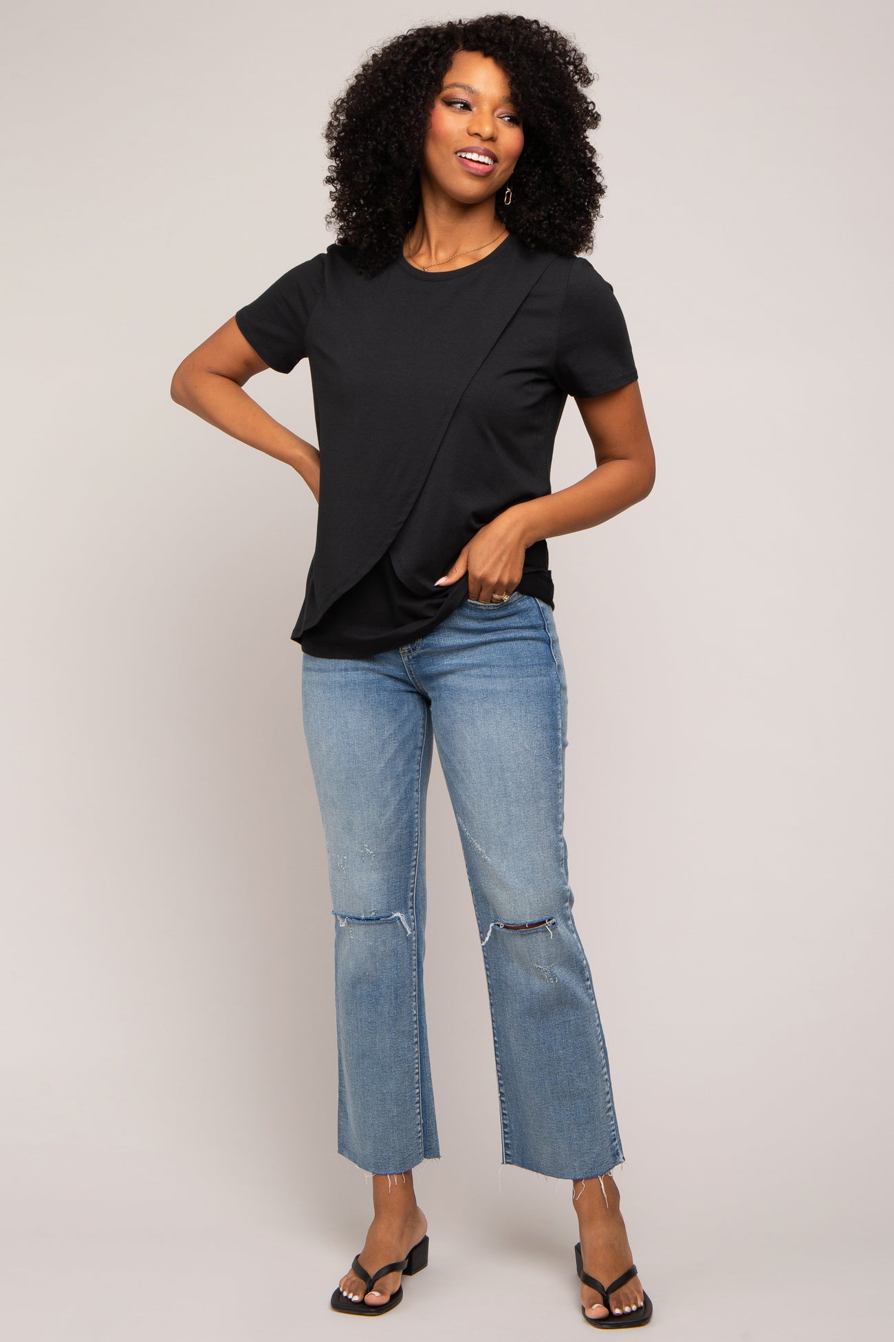 Details With a relaxed loose fit, this short sleeve nursing top keeps you cool and comfy all day long. The pull aside opening makes it easy for nursing while on the go. With a built-in pull-away tank top with light support underneath for added discretion, this nursing top is super convenient for busy moms. Content + Care