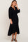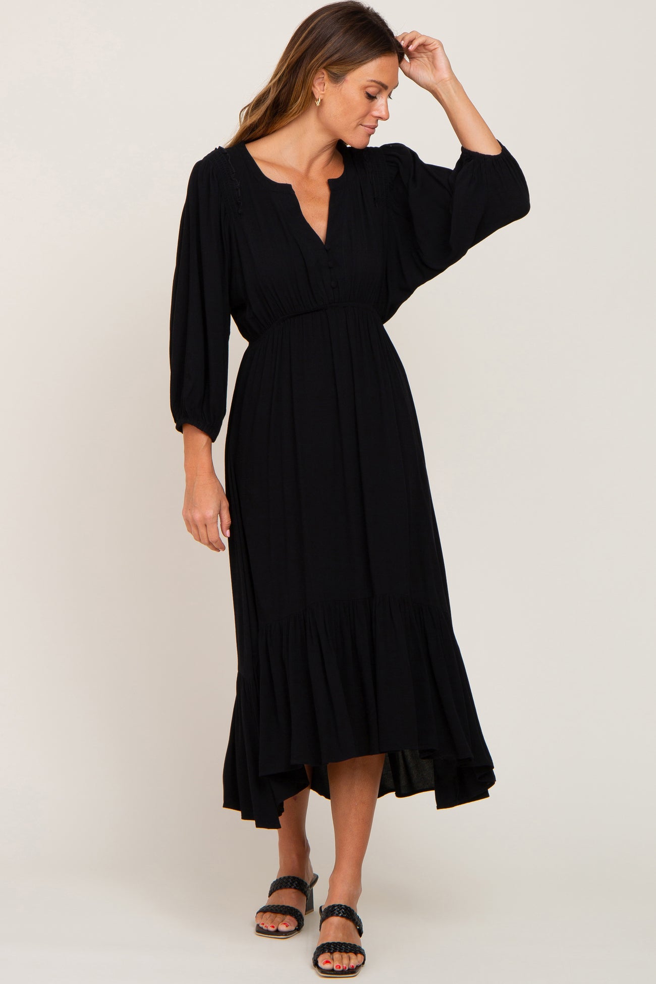 Details A solid midi dress featuring a hi-lo hemline, 3/4 length sleeves, a v- neckline, functioning front buttons, smocked shoulder accents, an elastic waist, and a gathered bottom hem. Content + Care