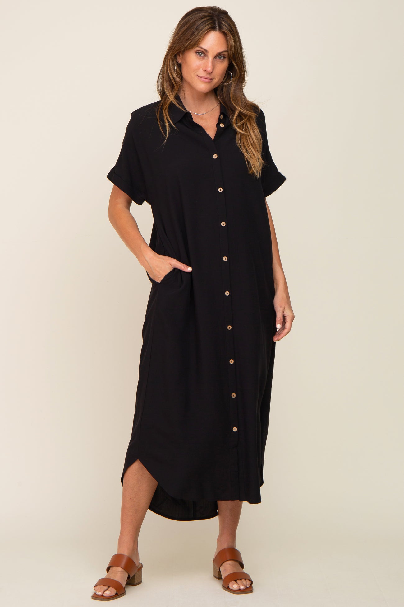 A solid short sleeve button down midi dress. Features collared neckline and side pockets.