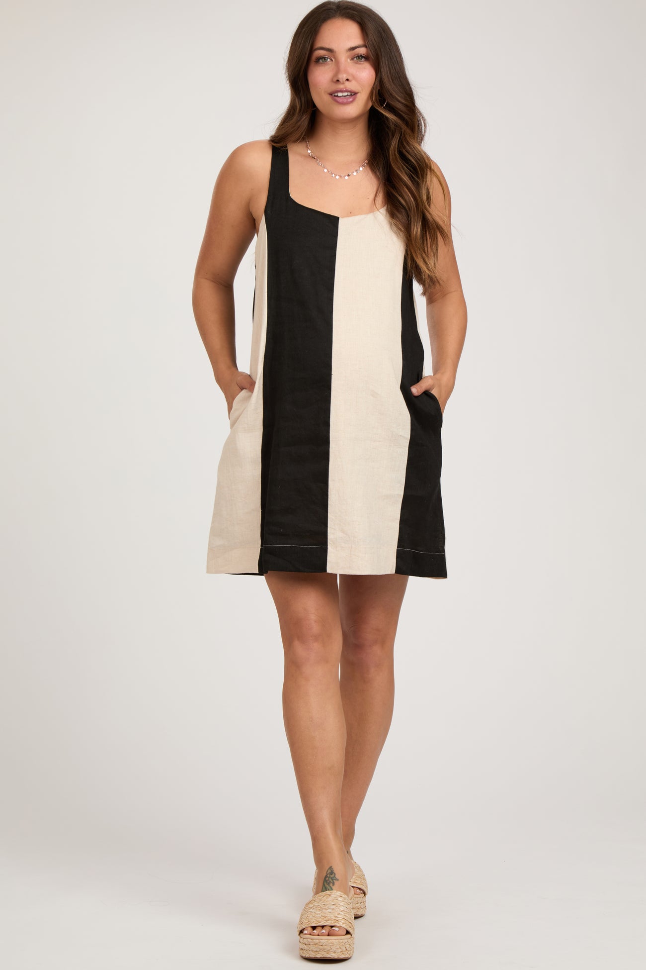A color blocked linen maternity dress featuring a slight square neckline, adjustable straps and double lining.