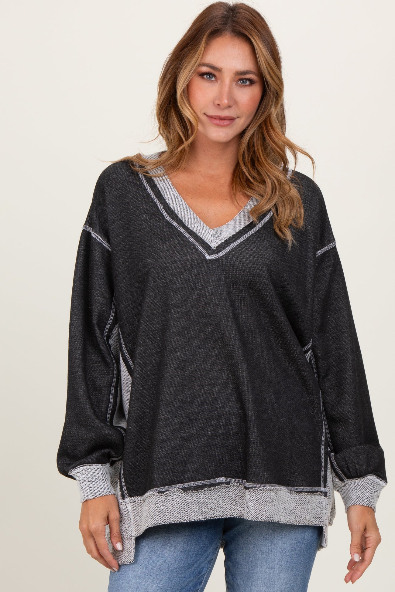 Elevate your casual wardrobe with our Black Contrast French Terry Long Sleeve Top. Crafted from soft, breathable French terry fabric, this relaxed-fit top features a flattering V-neckline and stylish contrast edging at the cuffs, hem, and neckline. The subtle two-tone design adds a modern touch to a classic silhouette, making it perfect for layering or wearing on its own. With dropped shoulders and a slightly oversized fit, it offers unbeatable comfort and effortless style for everyday wear. Pair it with jeans or leggings for a cozy yet chic look you'll love.