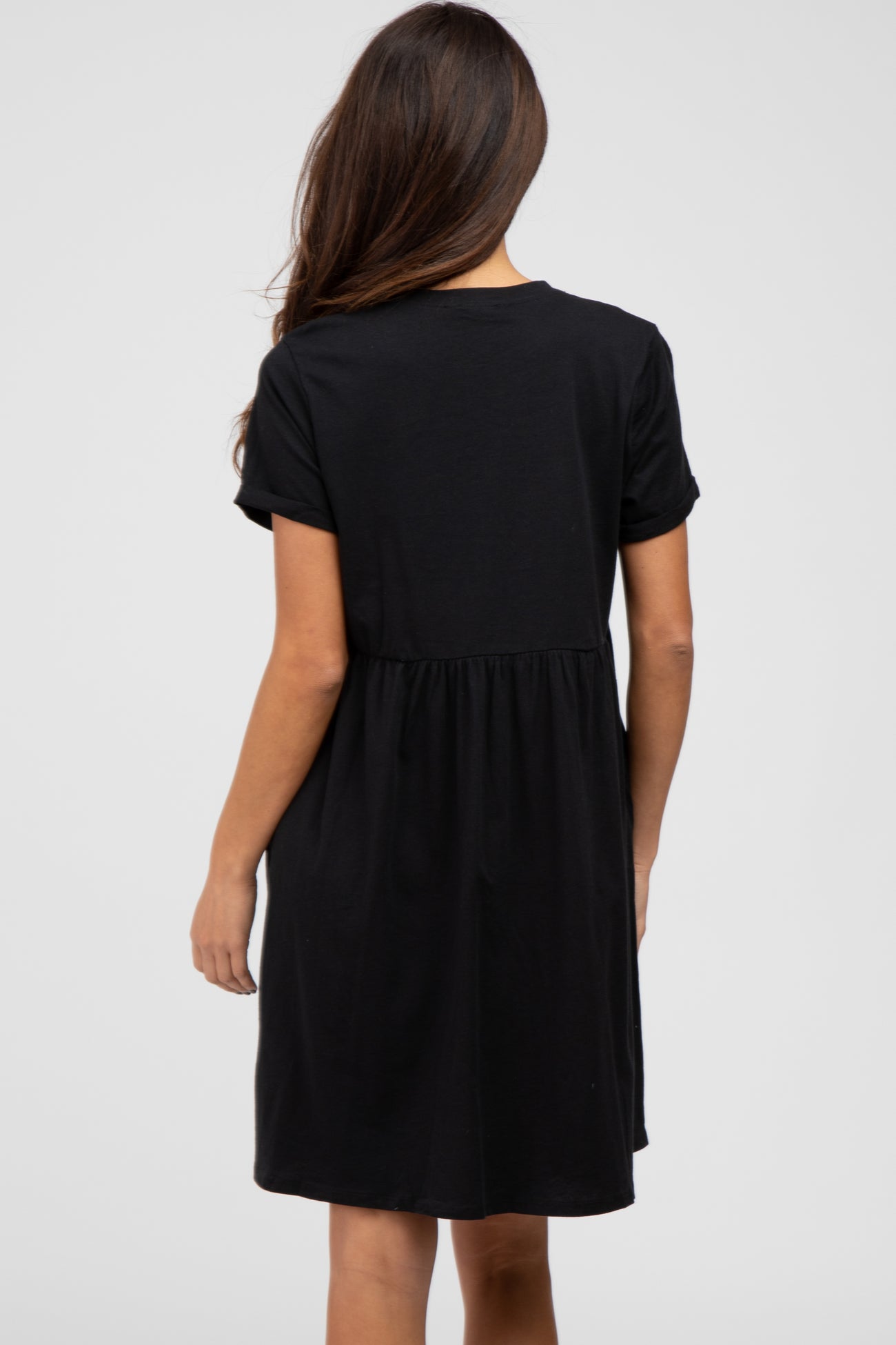 Details A solid hued t-shirt dress featuring a rounded neckline, short cuffed sleeves, an empire waist and side pockets. Content + Care