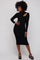 A solid ribbed knit midi dress with a mock neck, cutout detail on chest and back slit.