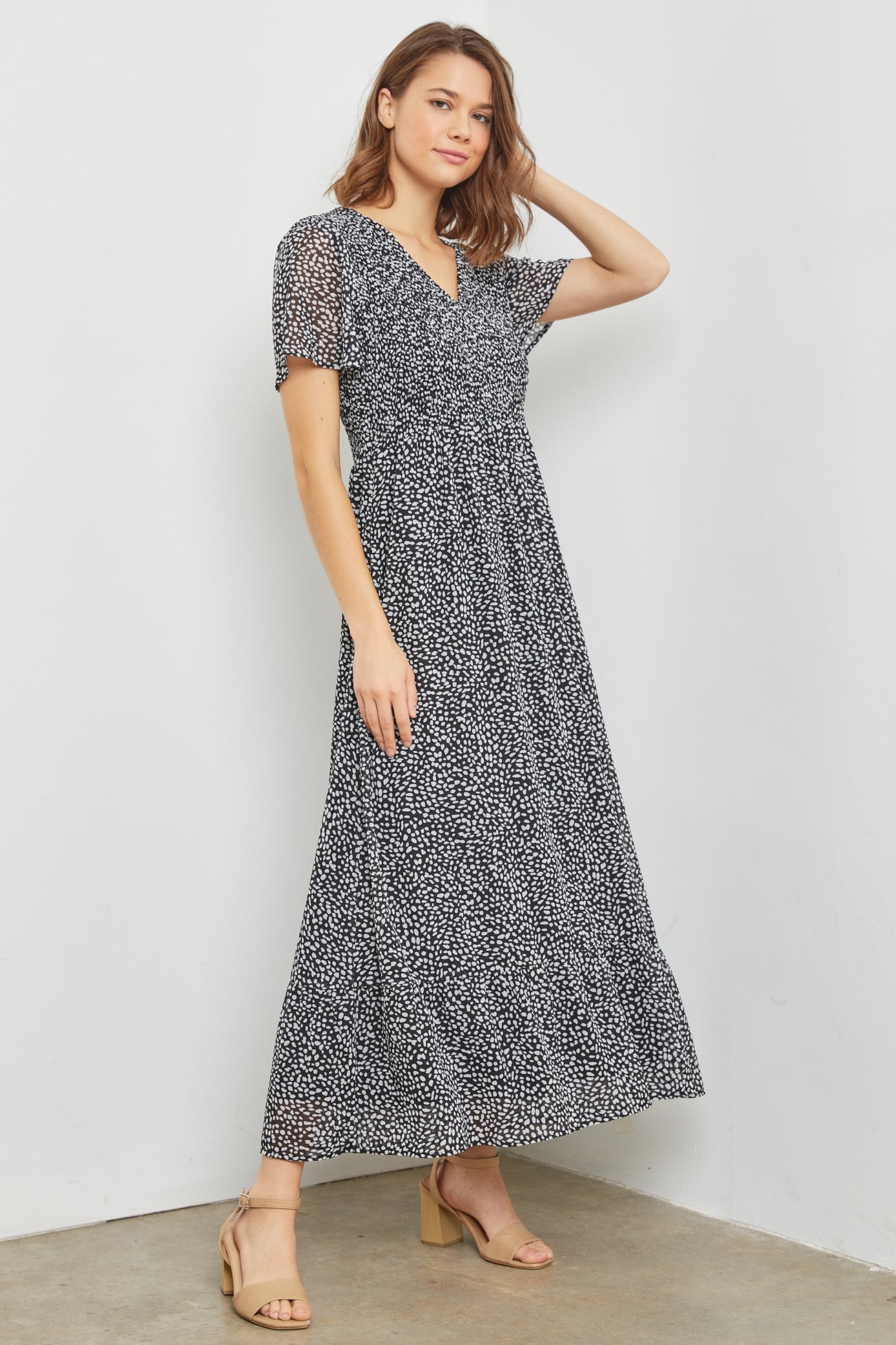 A dot print maternity maxi dress featuring a v-neckline, a smocked bodice, short flutter sleeves, a ruffle hem and double lining.