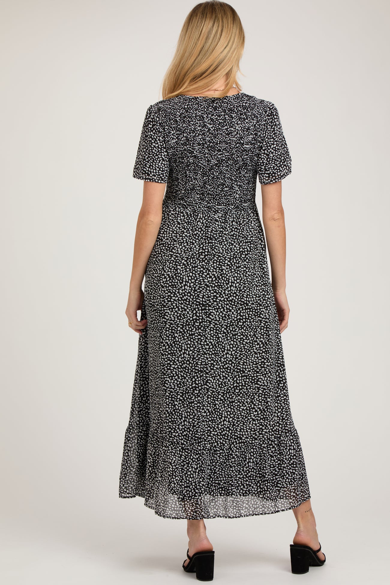 Black Dotted Smocked V-Neck Short Sleeve Maternity Maxi Dress