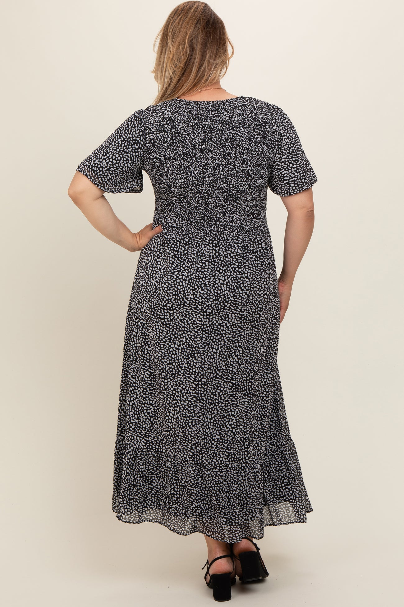 Black Dotted Smocked V-Neck Short Sleeve Maternity Plus Maxi Dress