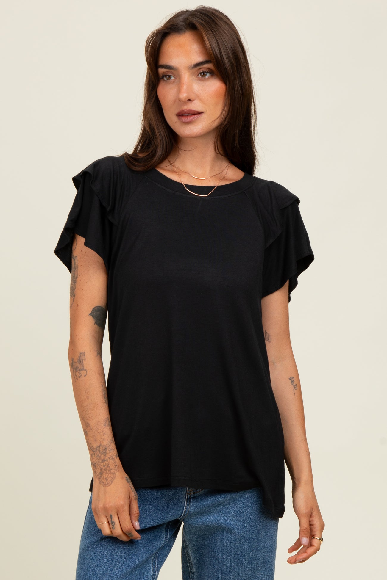Elevate your everyday look with this Black Double Ruffle Sleeve T-Shirt. Crafted from soft, breathable fabric, it offers all-day comfort and effortless style. The standout double ruffle sleeves add a feminine and playful touch, making this tee perfect for both casual outings and chic layered looks. Its relaxed fit pairs beautifully with jeans or skirts, allowing versatile styling options. A wardrobe essential that combines simple elegance with trendy detailing — dress it up or down for a look that’s uniquely you. Available in multiple sizes to ensure the perfect fit. Refresh your basics with this stylish must-have!