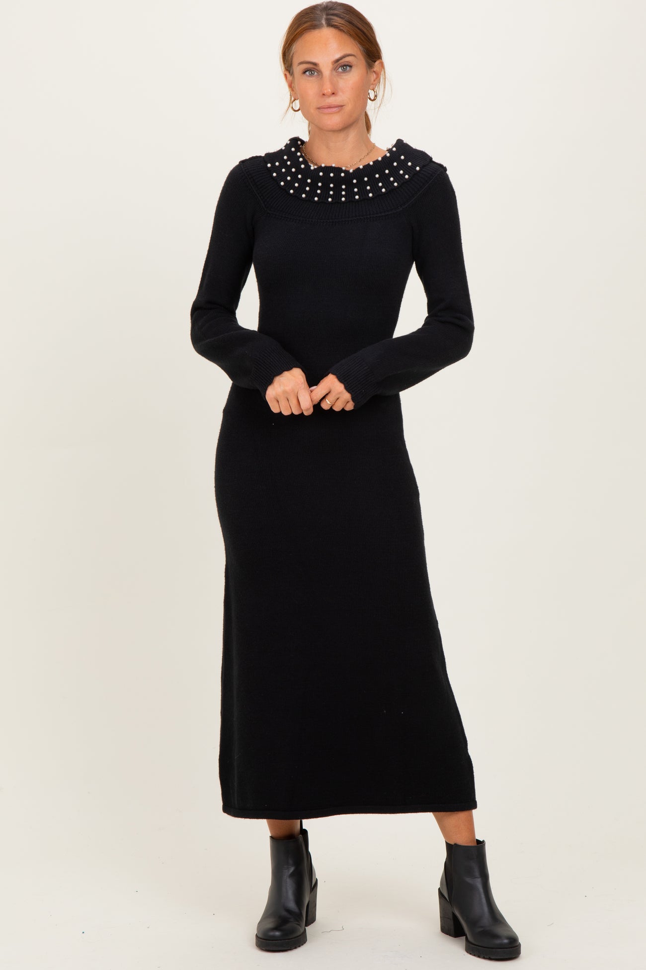 Elevate your wardrobe with this Black Faux Pearl Detail Off Shoulder Sweater Dress. Crafted from soft, cozy knit fabric, this dress offers warmth and elegance for cooler days. The off-shoulder neckline is beautifully adorned with delicate faux pearl accents, adding a touch of sophistication to the classic black silhouette. Featuring long sleeves and a midi length, it effortlessly combines comfort and style. Perfect for both casual outings and special occasions, pair it with ankle boots or heels for a chic, polished look. Embrace timeless elegance with this must-have dress.