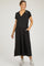 A fleece knit maternity midi dress with a v-neckline, short sleeves, a hood, and side pockets.