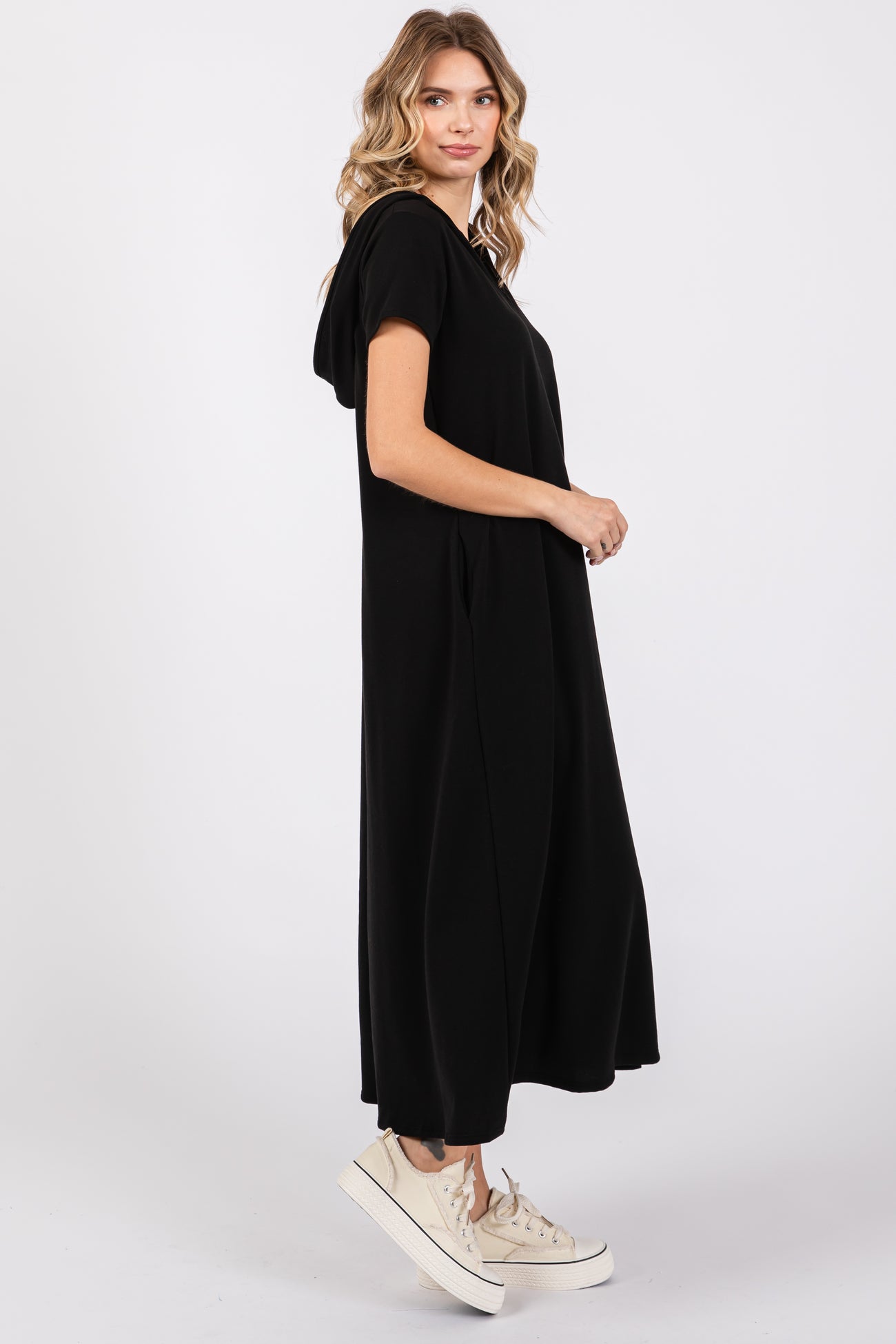 A fleece knit midi dress with a v-neckline, short sleeves, a hood, and side pockets.
