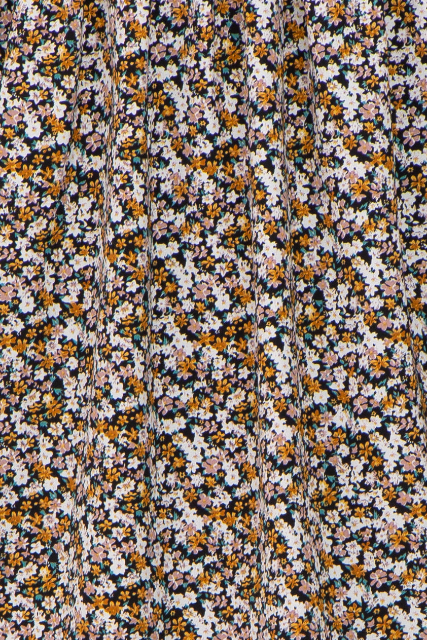 A floral dress with a square neckline, long semi sheer balloon sleeves, smocked sleeve cuffs, and a back zipper and tie closure. Body is lined.