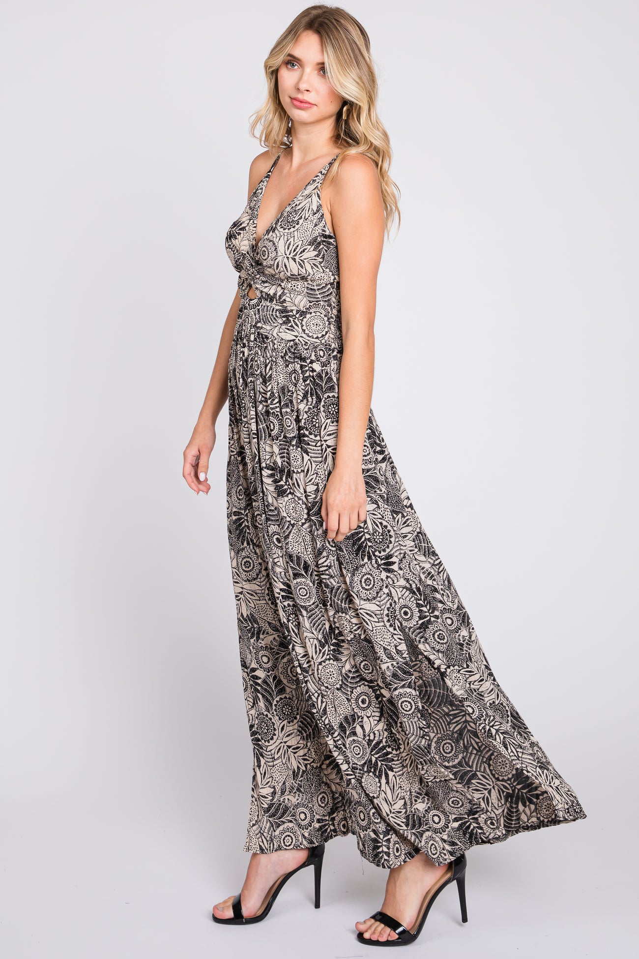 Details A floral print maxi dress featuring a v-neckline, a front knot, a cutout under the bust, a smocked back, adjustable cami straps and side slits. Content + Care